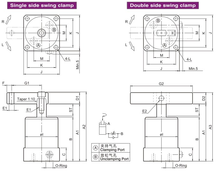 It is recommended that air pressure angle cylinder be used. A. B inlet should be equipped with flow control valve to avoid excessive speed and to avoid clamping workpiece during angle stroke, which may cause damage to cylinder and internal parts.
