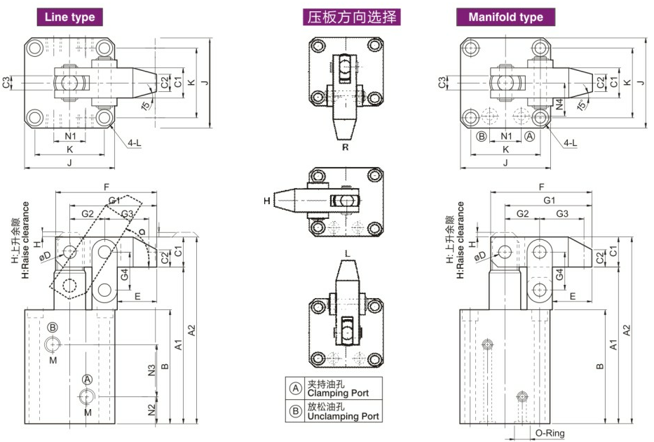 此形式油壓缸,夾持機(jī)構(gòu)為杠桿原理,活塞推出為夾緊狀態(tài),主要機(jī)構(gòu)零件安裝于缸體外部,易于維護(hù)。