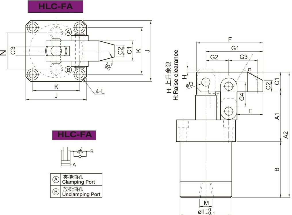 此形式油壓缸,夾持機構為杠桿原理,活塞推出為夾緊狀態(tài),主要機構零件安裝于缸體外部,易于維護。